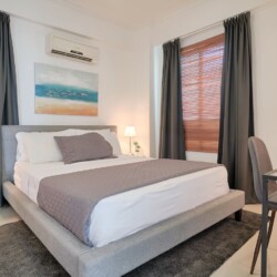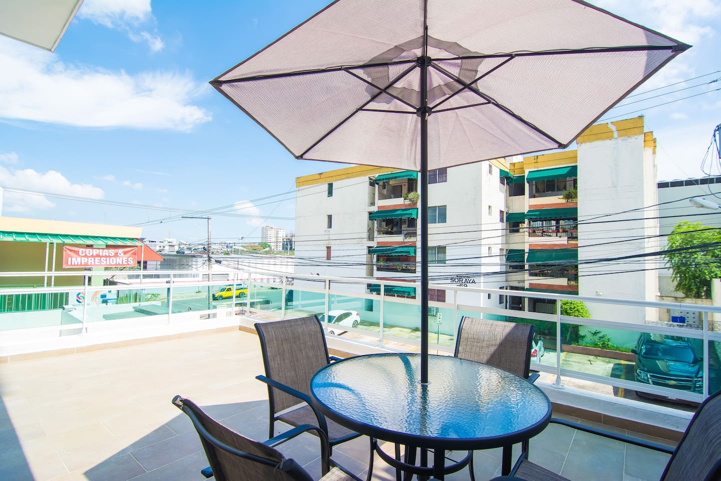 This New and SPACIOUS One-Bedroom Apartment is located in the CITY CENTER (BEST LOCATION) of Santo Domingo. Enjoy the Street Views from the Comfortable Living Room with LARGE PRIVATE TERRACE with Seating Area and an Open FULLY EQUIPPED KITCHEN. The Apartment comes with AC, Fan, TWO SMART TV’s with Cable (1000+ CHANNELS & MOVIES), SMART SPEAKER, FAST WIFI, Washer/Dryer, SOFABED, INBUILDING PARKING, a SHARED GYM and ROOFTOP TERRACE and BARBECUE. Steps away from BLUE MALL, HIGHLIGHTS, Restaurants..