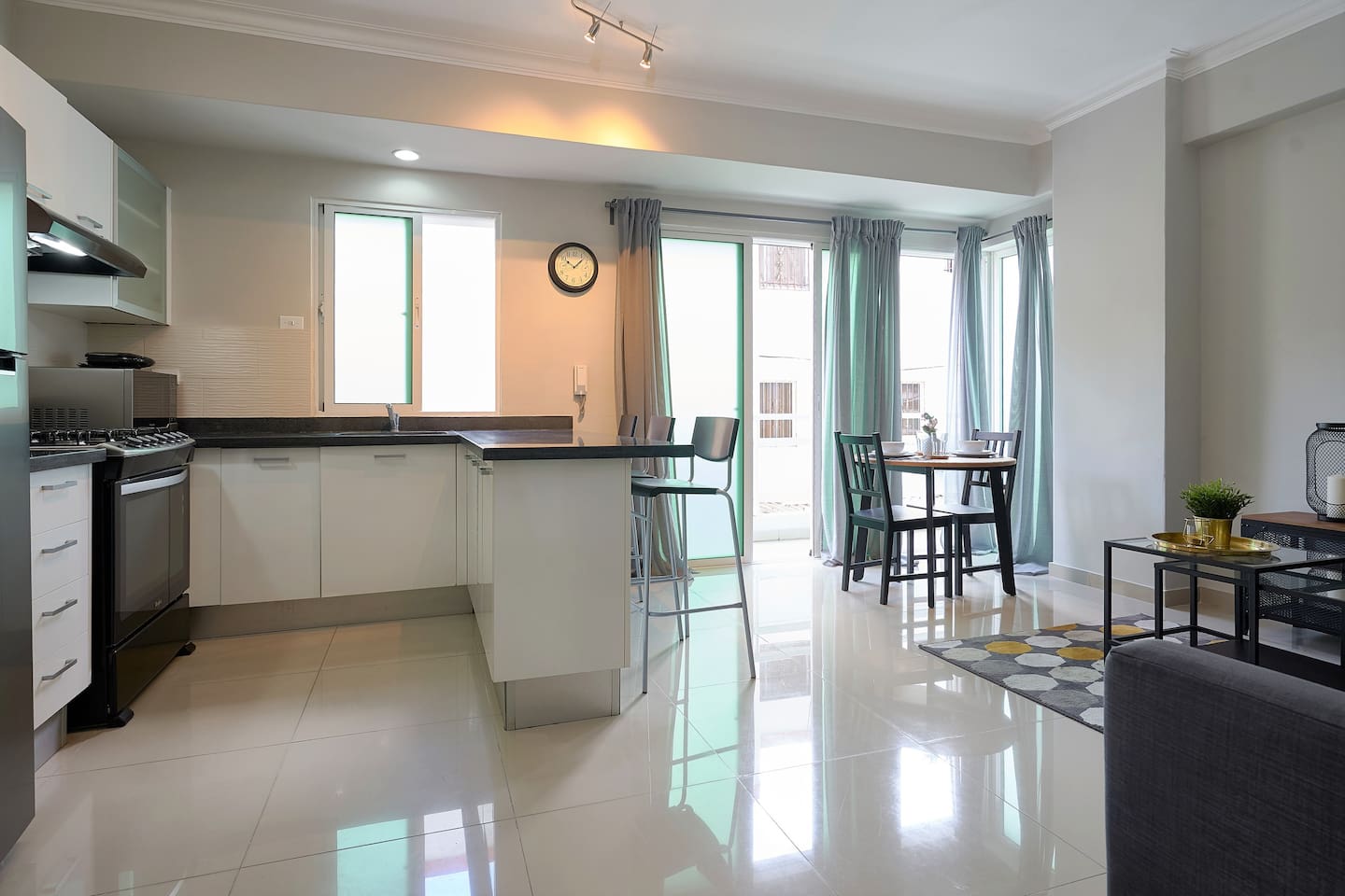 This modern and luxury one-bedroom apartment is fully equipped with alltraveler’s needs. It is quiet, private, secure and located in a luxury and modern building, near the best restaurants shopping malls and hotels in the city center of Santo Domingo. Great city views, several leisure & sports areas in and around the building. The apartment comes with one bedroom and a spacious living room with sofabed and large open kitchen.